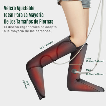 - El dispositivo utiliza compresión de aire y calor para aliviar la tensión y el dolor en las piernas, pantorrillas y pies, mejorando la circulación y reduciendo la hinchazón.