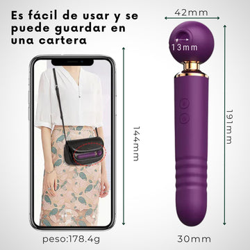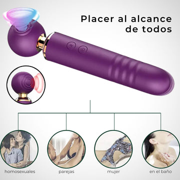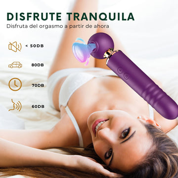 - El masajeador ofrece una estimulación doble que combina vibración y succión para estimular simultáneamente el clítoris y la vagina, proporcionando orgasmos intensos y placenteros.