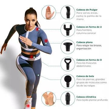 - El dispositivo incluye 6 cabezales de masaje intercambiables: un cabezal redondo para músculos grandes, uno en forma de U para áreas como la columna, un cabezal plano para todo el cuerpo, uno de bala para puntos de acupresión, y otros especializados para diferentes zonas musculares.